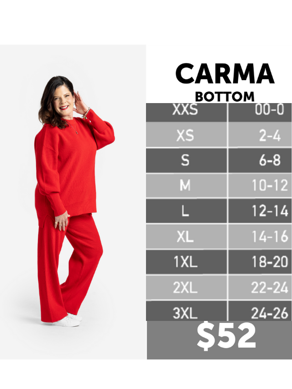 The Carma Bottom brings the perfect complement with its ribbed waistband, adjustable drawcord, and relaxed full-length leg—giving you a customizable fit with a smooth, elevated silhouette. The Carma Pant has a 29 1/2" inseam and grades up to 31".